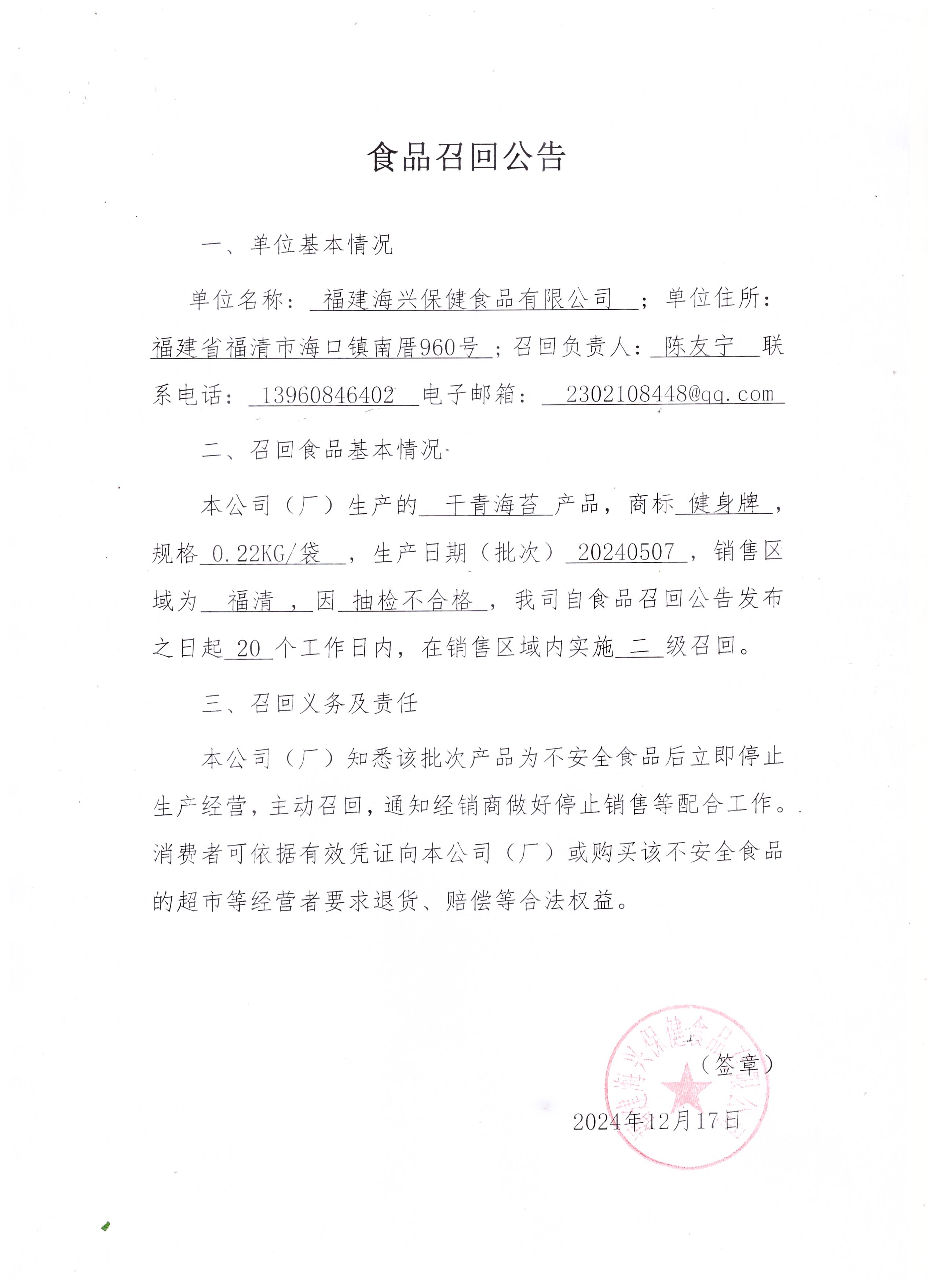福建海兴保健食品有限公司食品召回公告(20241217)
