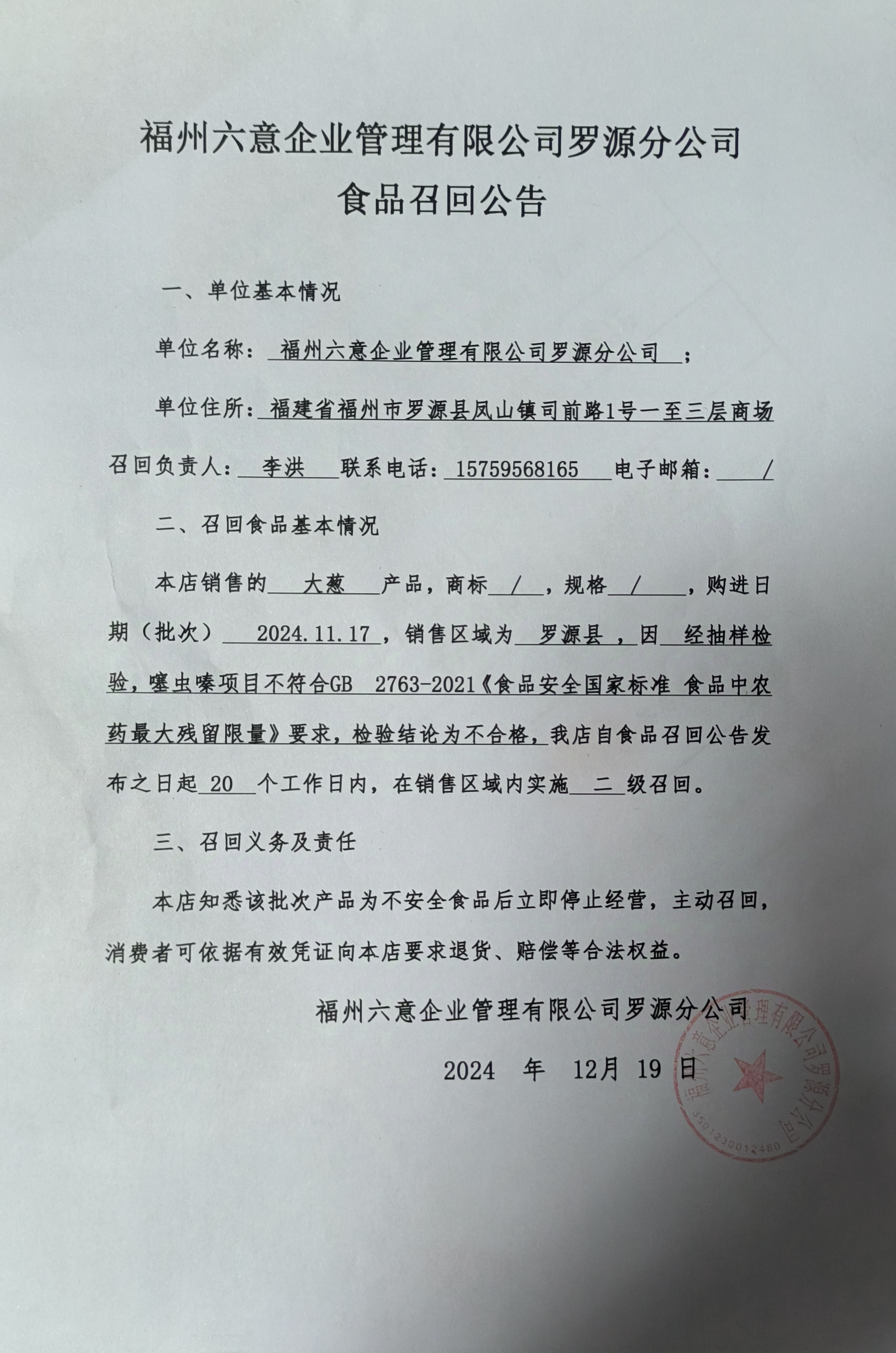福州六意企业管理有限公司罗源分公司食品召回公告(20241219)