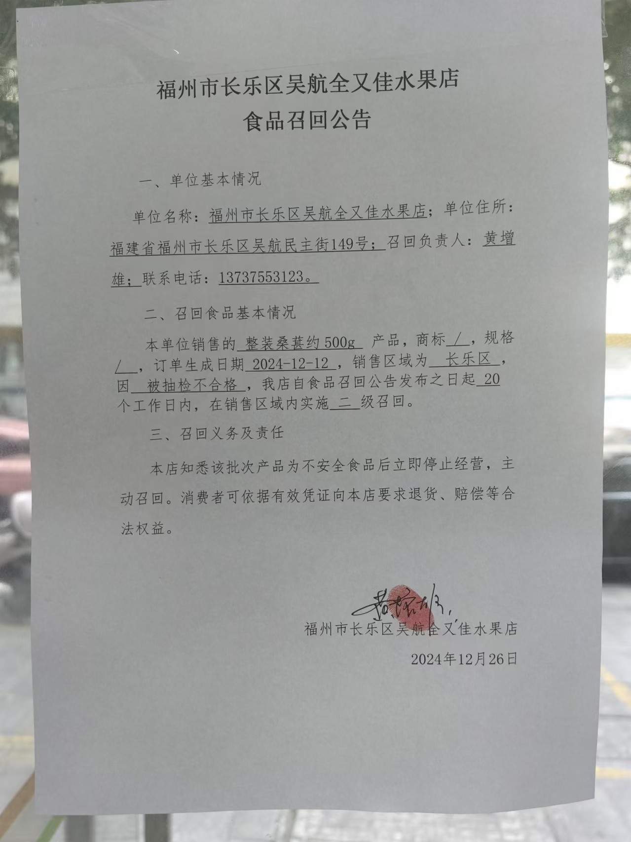 福州市长乐区吴航全又佳水果店食品召回公告(20241226)