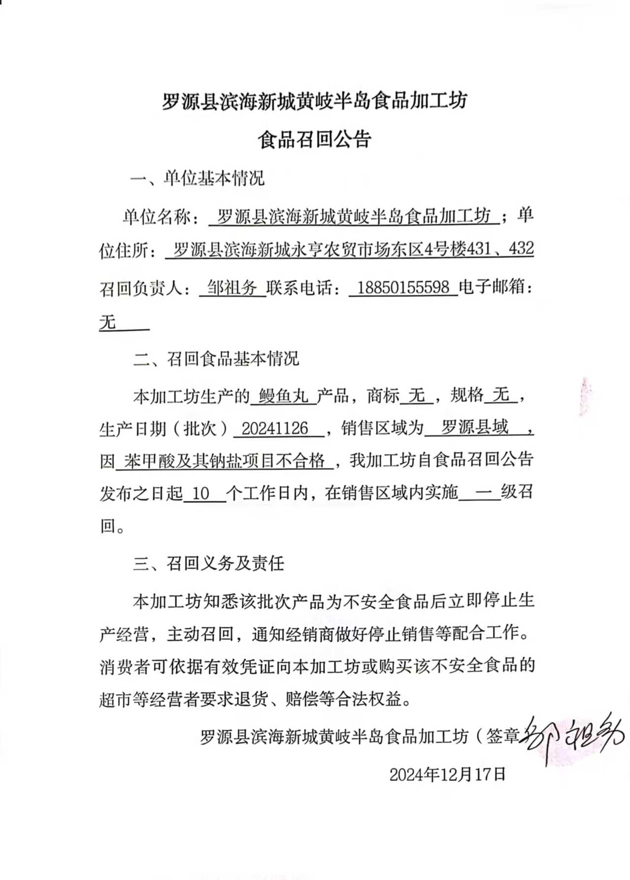 罗源县滨海新城黄岐半岛食品加工坊食品召回公告(20241217)