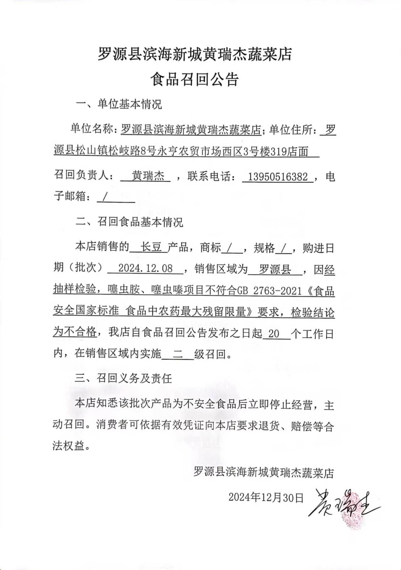 罗源县滨海新城黄瑞杰蔬菜店食品召回公告(20241230)