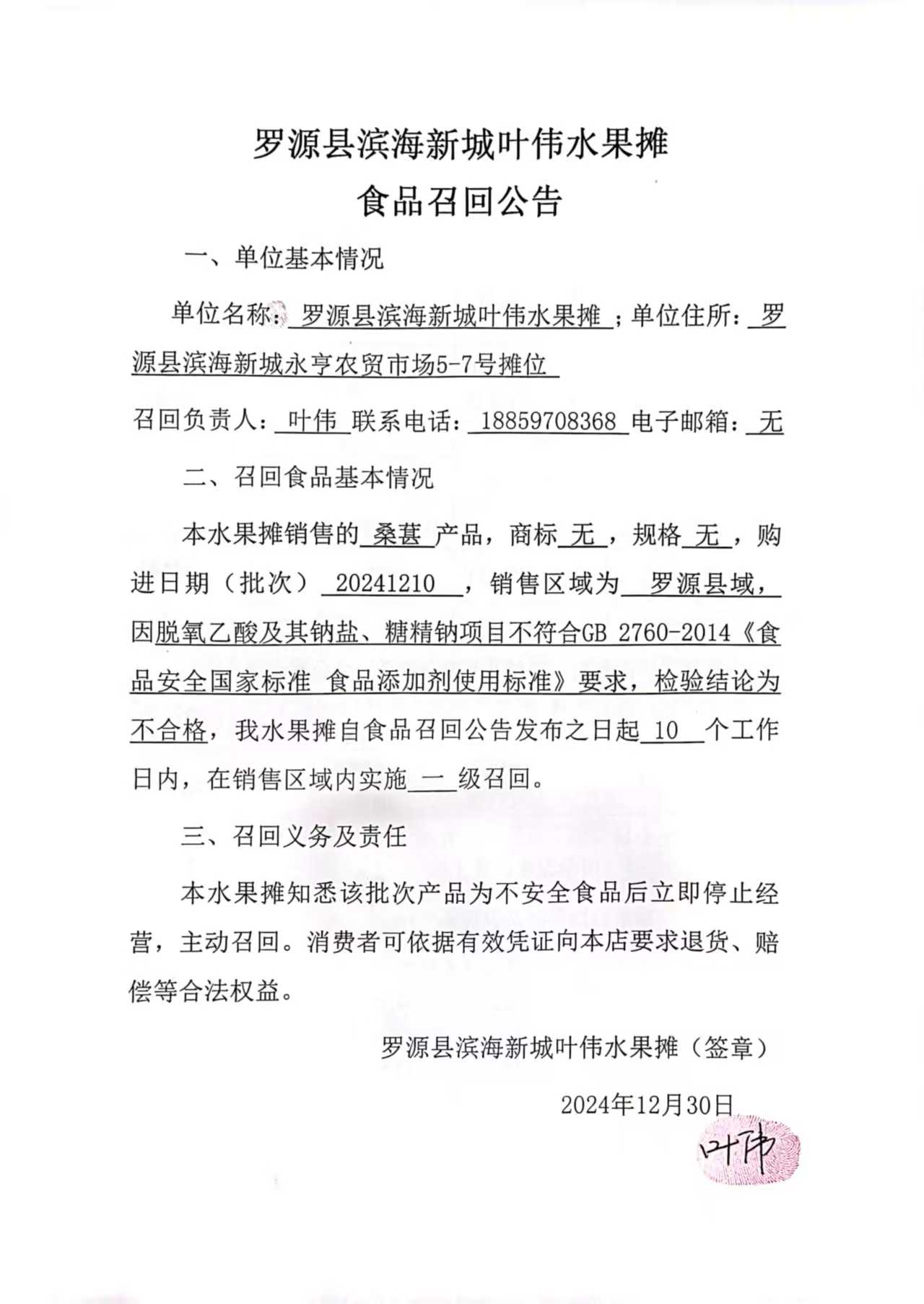 罗源县滨海新城叶伟水果摊食品召回公告(20241230)