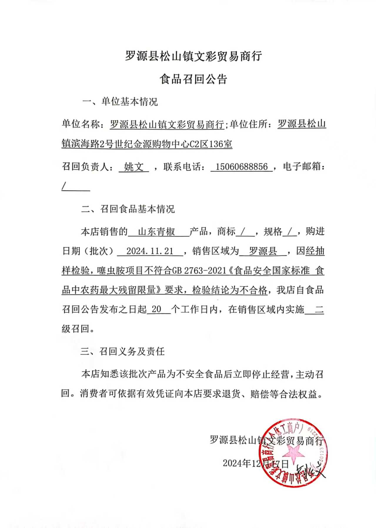 罗源县松山镇文彩贸易商行食品召回公告(20241217)