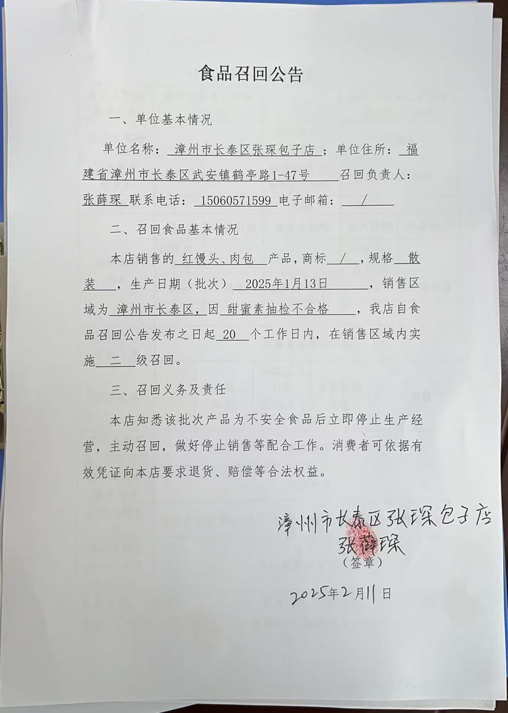 漳州市长泰区张琛包子店食品召回公告(20250211)