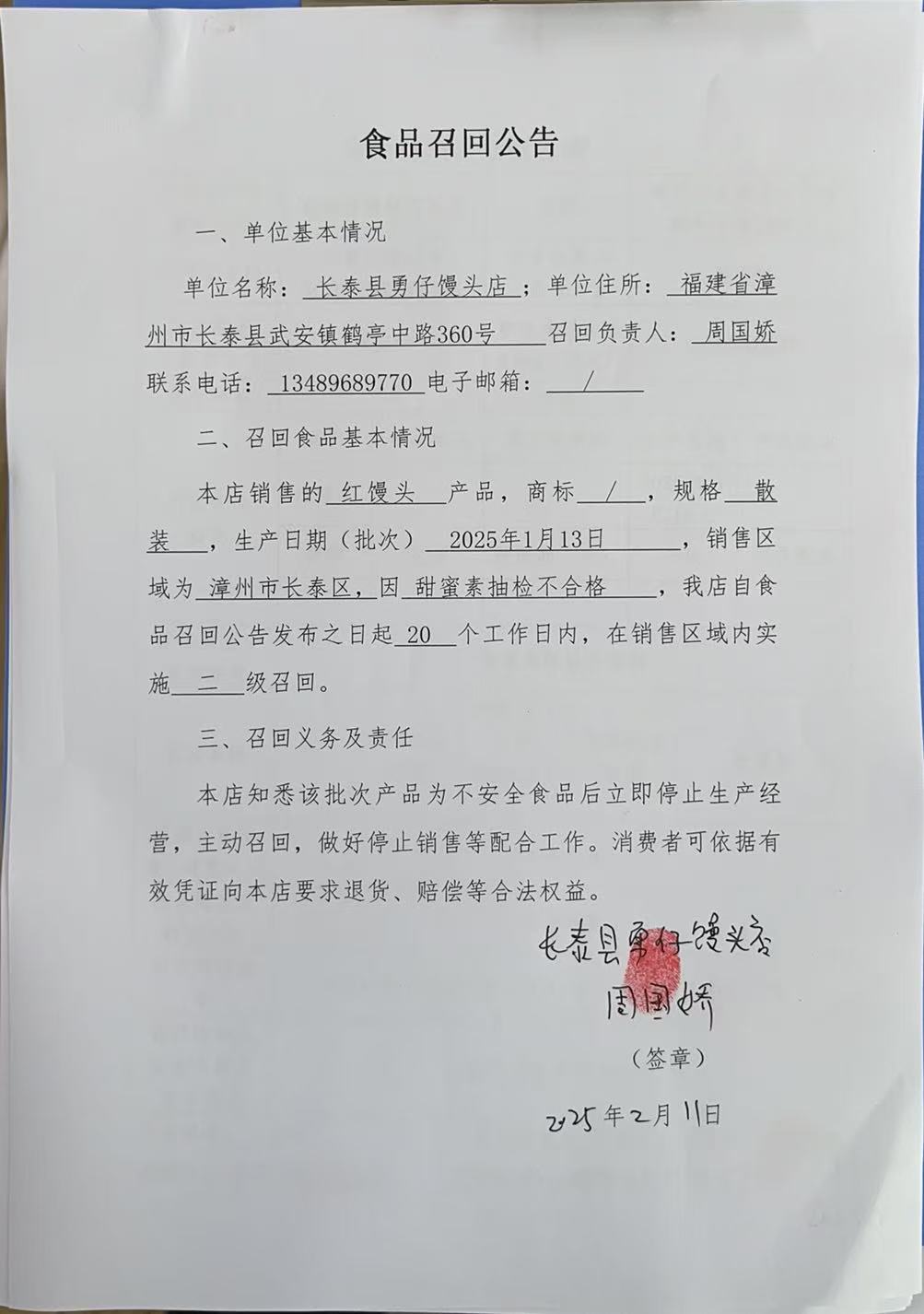 漳州市长泰县勇仔馒头店食品召回公告(20250211)