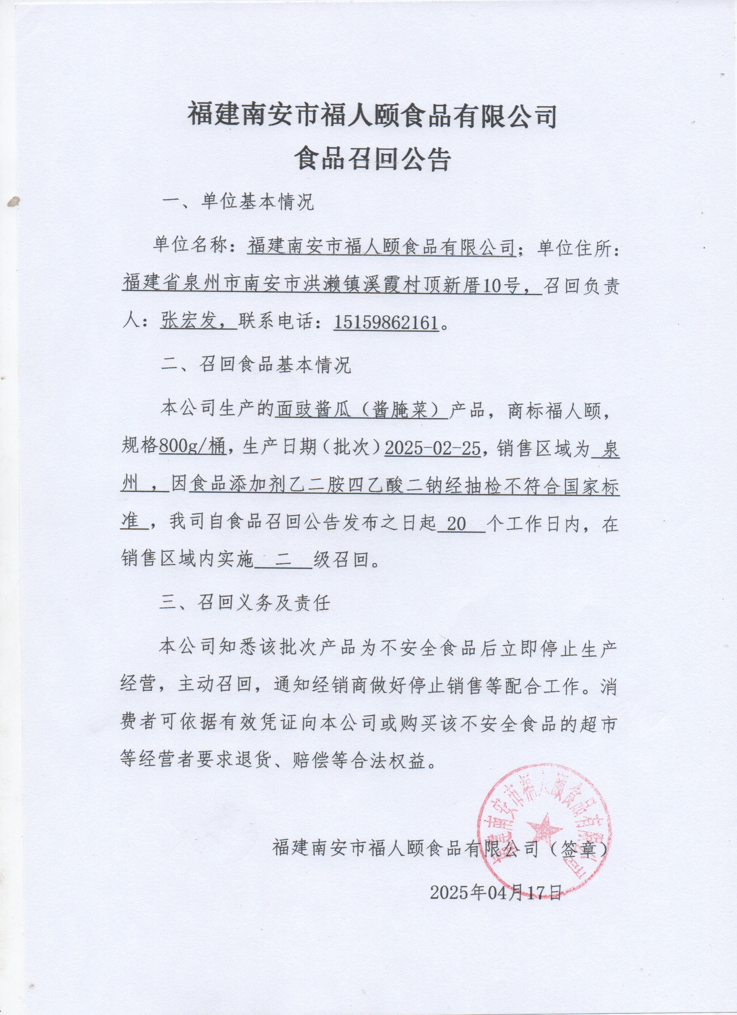 福建南安市福人颐食品有限公司食品召回公告(20250417)