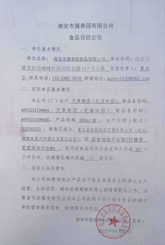 南安市漫香园食品有限公司食品召回公告(20250421)