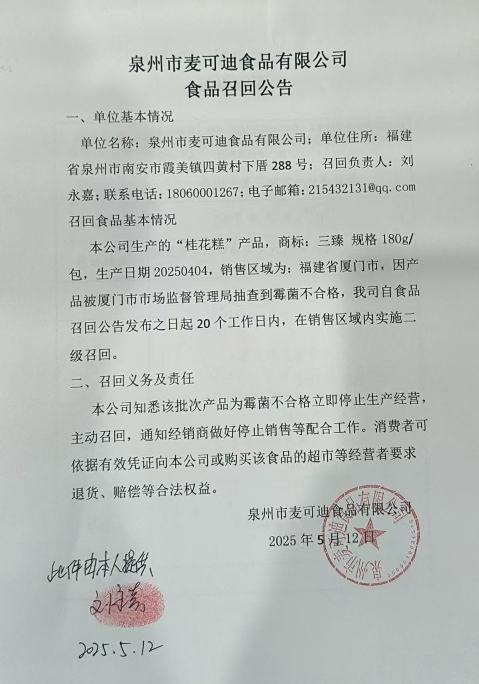泉州市麦可迪食品有限公司食品召回公告(20250512)