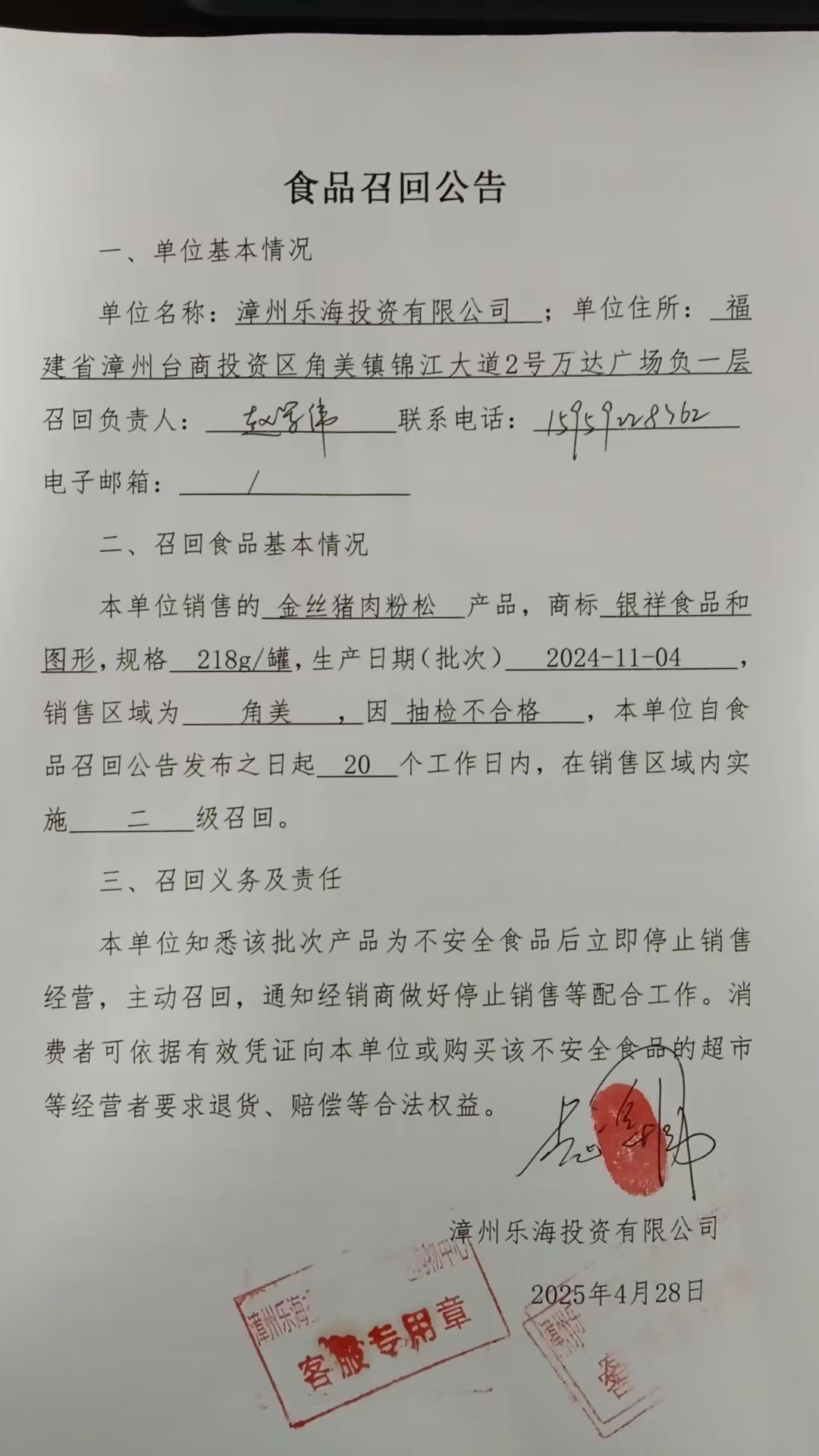漳州乐海投资有限公司食品召回公告(20250428)