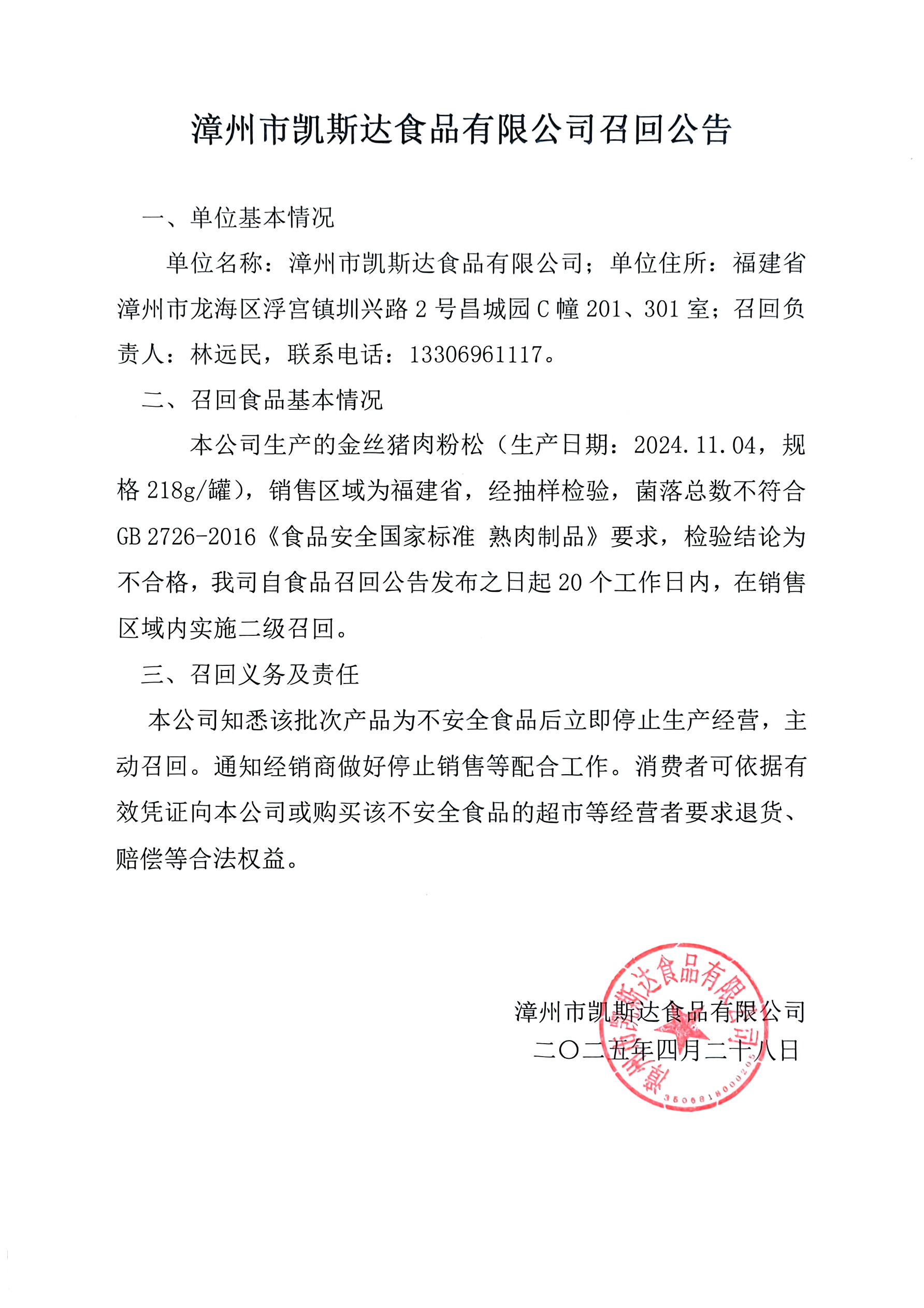 漳州市凯斯达食品有限公司食品召回公告(20250428)