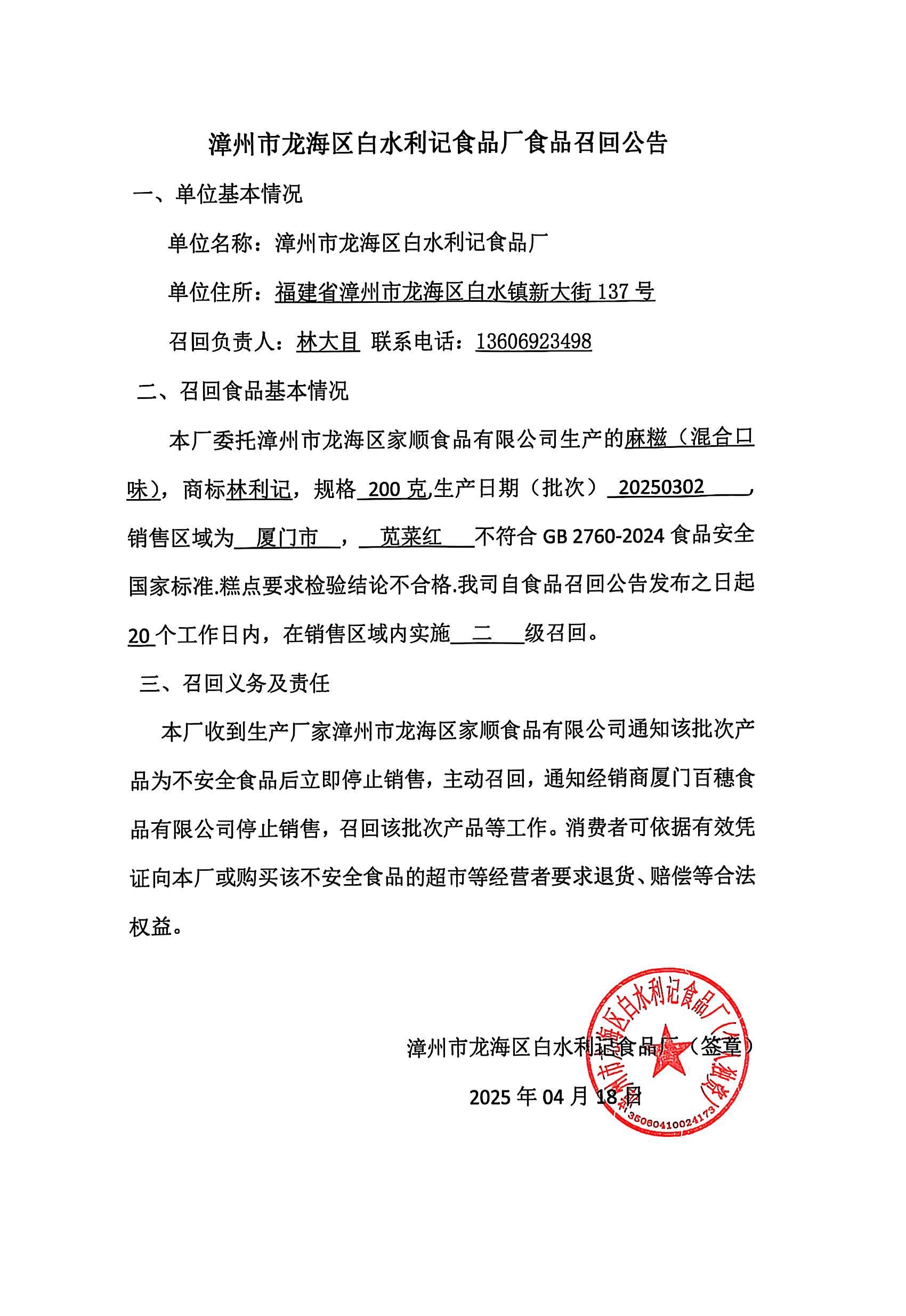 漳州市龙海区白水利记食品厂食品召回公告(20250418)