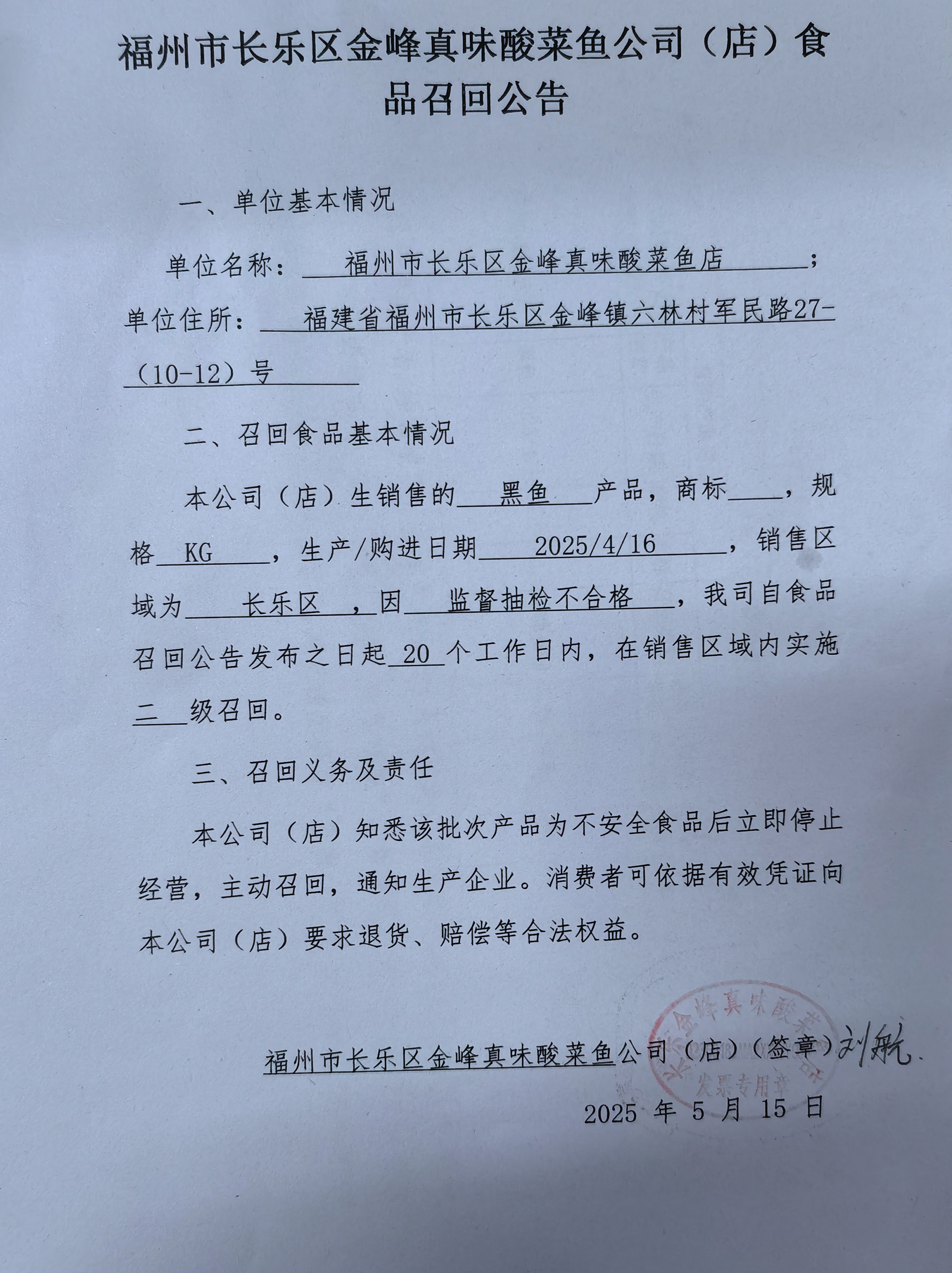 福州市长乐区金峰真味酸菜鱼店食品召回公告(20250515)