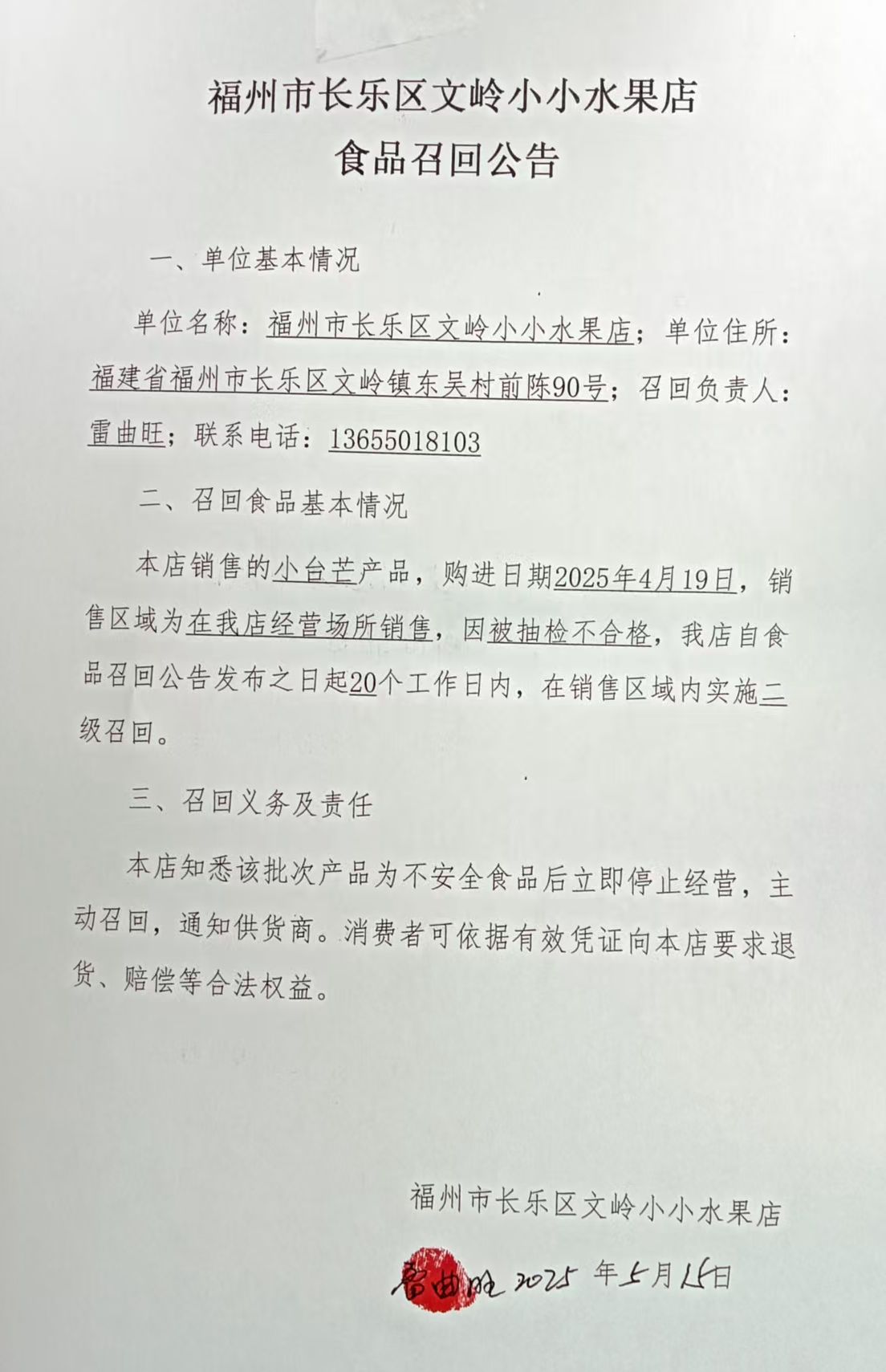 福州市长乐区文岭小小水果店食品召回公告(20250515)