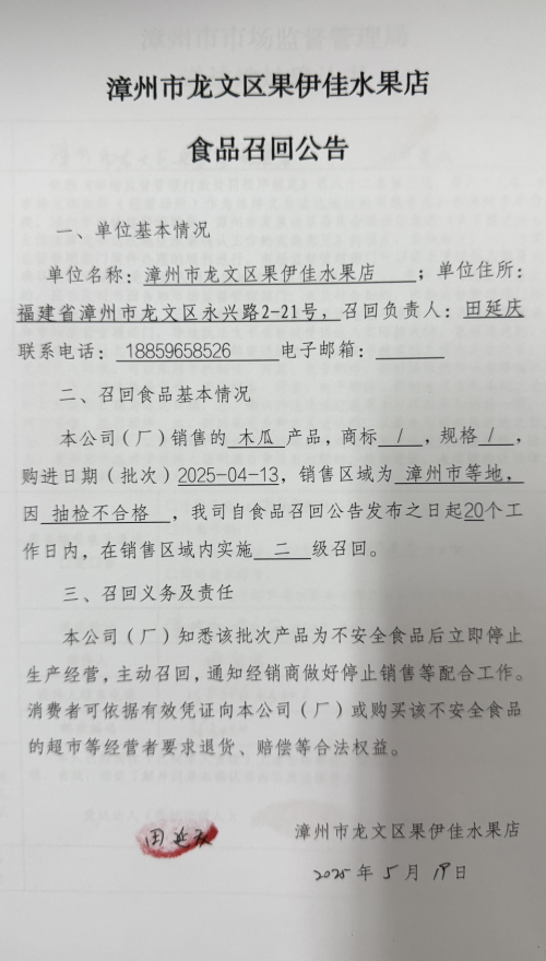 漳州市龙文区果伊佳水果店食品召回公告(20250519)
