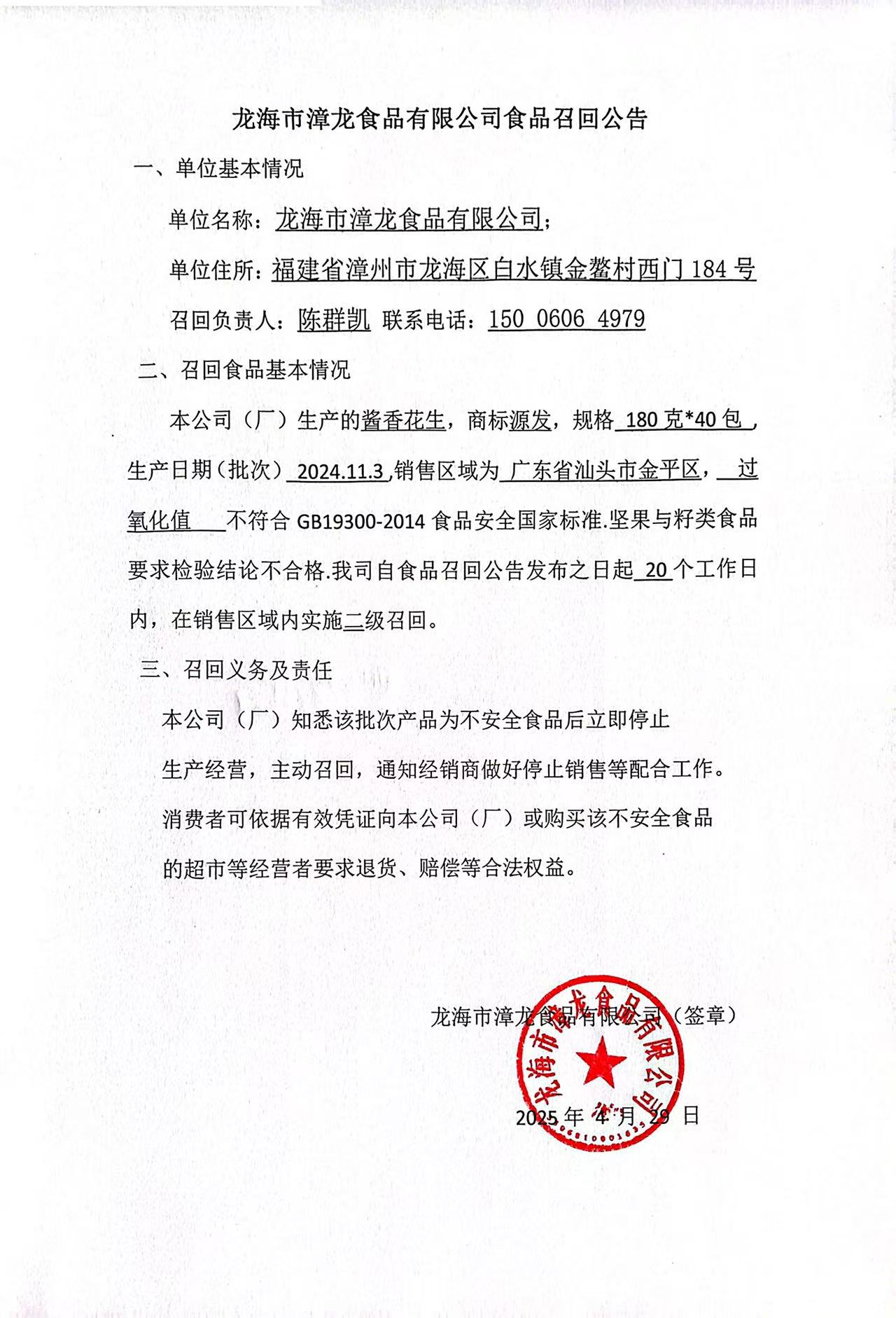龙海市漳龙食品有限公司食品召回公告(20250429)